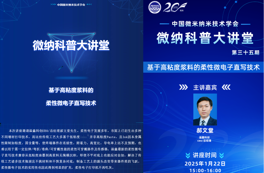 中國微米納米技術學會是國家教育部及清華大學牽頭成立的科學領域權威組織機構,其為普及新型柔性印刷電子技術,特于2024年3月第25期和2025年1月第35期特舉辦“柔性電子”為主題的科普大講堂,兩次均特別邀請國內柔性印刷電子專業供應商---溢鑫科創做專題報道,內容涉及主流柔性印刷電子技術,工藝,應用及產業市場前景等;現網上已免費公開講座視頻,歡迎指導交流,更多技術細節及應用案例請聯系我司